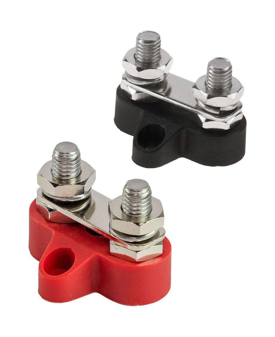 Клеммы плюсовая и минусовая с резьбовым зажимом и перемычкой. Основание клеммы изготовлено из армированного нейлона, контактная группа из никелированной латуни.