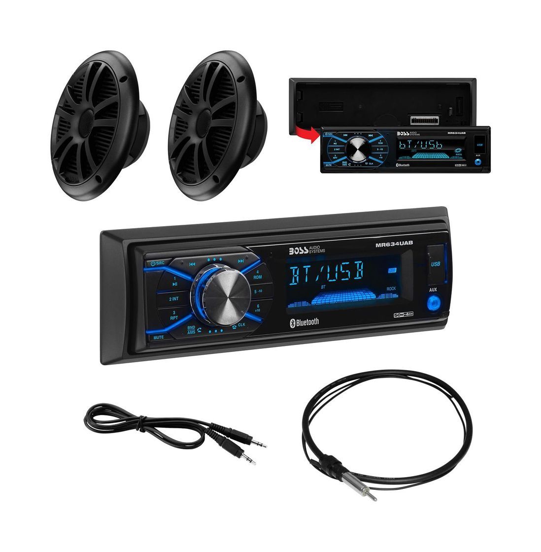 Морской радиоприемник MR634UAB с динамиками MR6B 6,5". Данная модель представляет собой всепогодный приемник с Bluetooth-функцией, AM/FM-тюнером и USB-портом. Прибор оснащен съемной лицевой панелью с защитой от ультрафиолетового излучения, а также дипольной антенной MRANT10. Основные характеристики: * Установка в один DIN слот. * Функция громкой связи Bluetooth®. * Переключение частот тюнеров для США и ЕС. * Печатная плата с защитным покрытием. * Динамики MR6B 6,5" с максимальной мощностью 180 Ватт (2 х 90) с тканевым диффузором, пропитанным смолой и полипропиленовым конусом.
