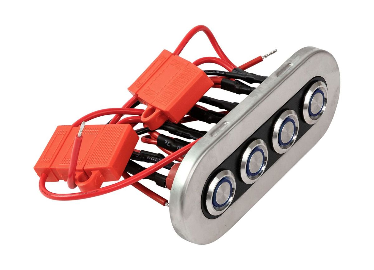 Бортовая панель на четыре кнопочных выключателя с подсветкой Комплектуется информационными наклейками и накладкой из нержавеющей стали.