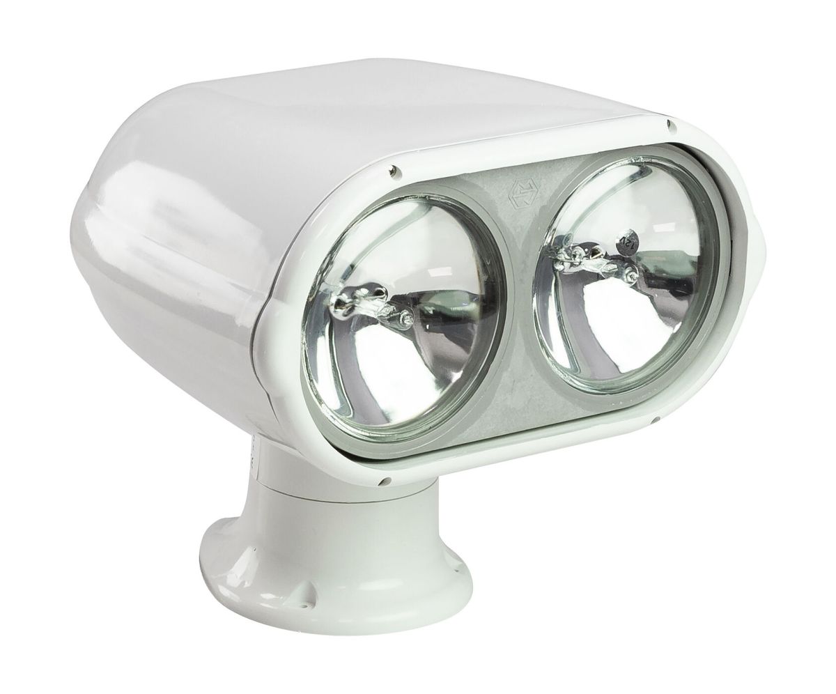 Морской прожектор с двумя галогеновыми фарами. Корпус изготовлен из прочного пластика белого цвета. Управляется проводным пультом, который монтируется в любом удобном месте, длина провода 4 метра. Угол поворота 360°, угол подъёма/опускания - 70°. Размер панели управления: 122х92 мм, монтажный вырез 90х65 мм