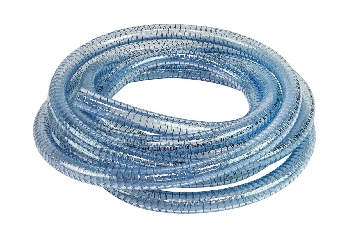 Шланг из прозрачного ПВХ армированный стальной спиралью. Очень гибкий - может быть изогнут без залома по радиусу равному внешнему диаметру шланга. Пригодин для использования с пресной водой.